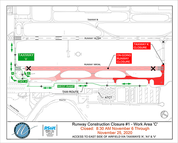 Runway closure #1 is subdivided into three work areas in order to maximize the length of time that both Taxiways K and V are open for cross-airfield traffic. Refer to the exhibits. Work Area A will be closed the entire duration of Runway Closure #1, however access to the east side of the airfield is maintained via both Taxiways K and V. Work Area B includes the north end of Runway 16R/34L and was closed from October 21 through November 6, 2020. Access to the east side of the airfield will be via Taxiway K only. Work Area C includes the south end of Runway 16R/34L and will be closed from November 6 until November 25, 2020. Access to the east side of the airfield will be via Taxiway V only.